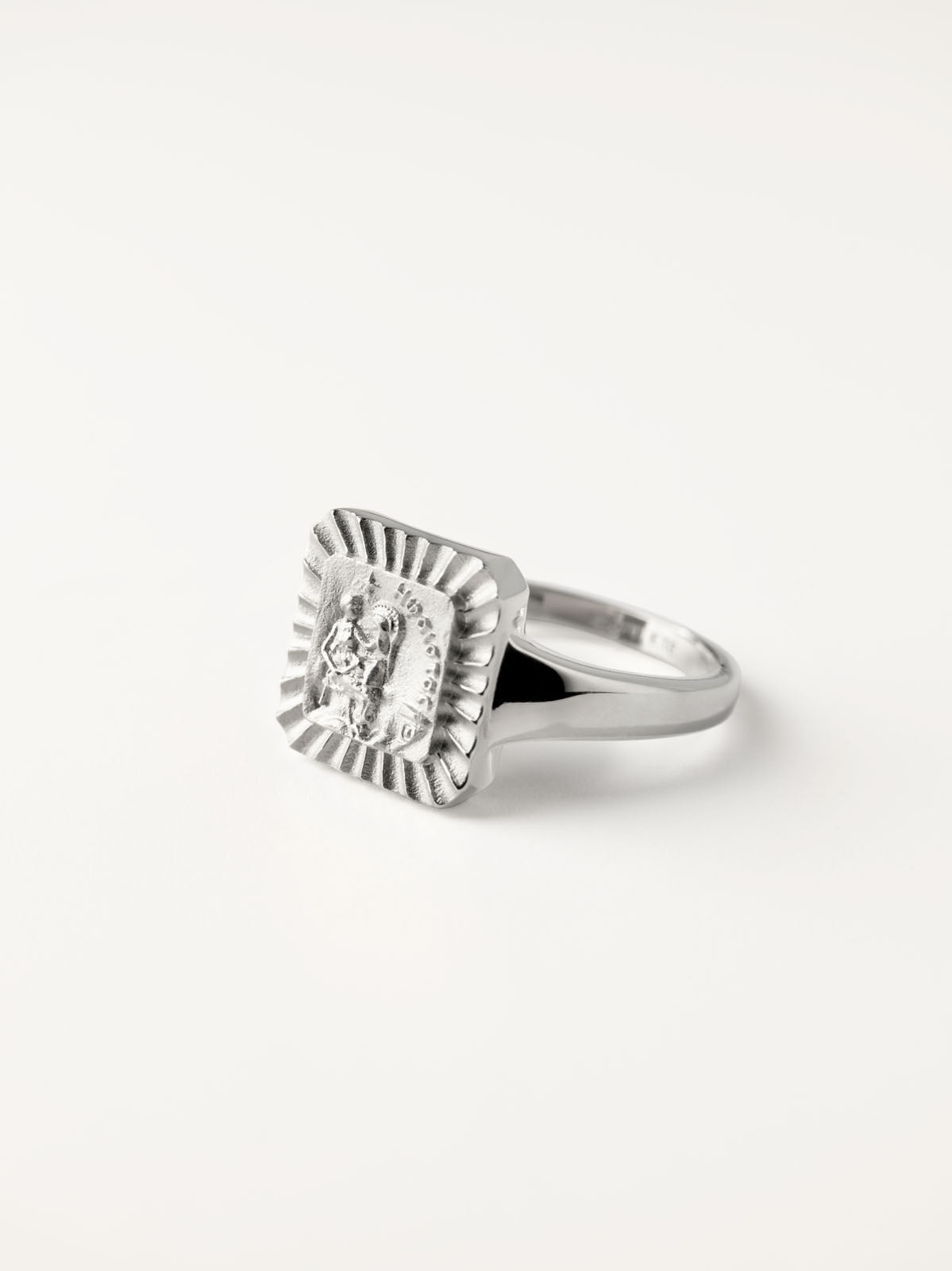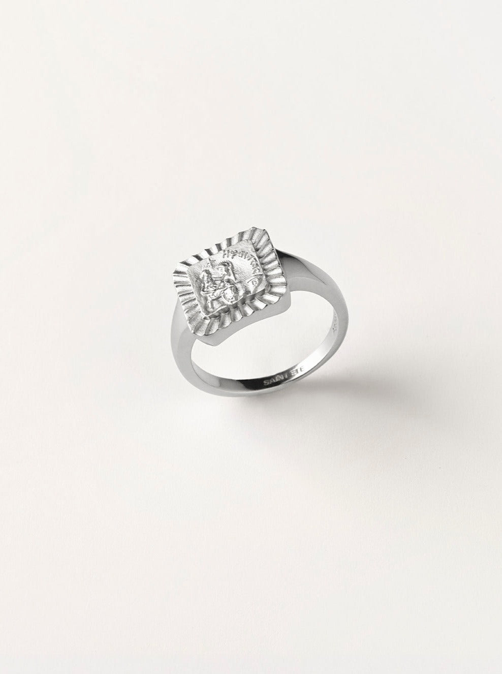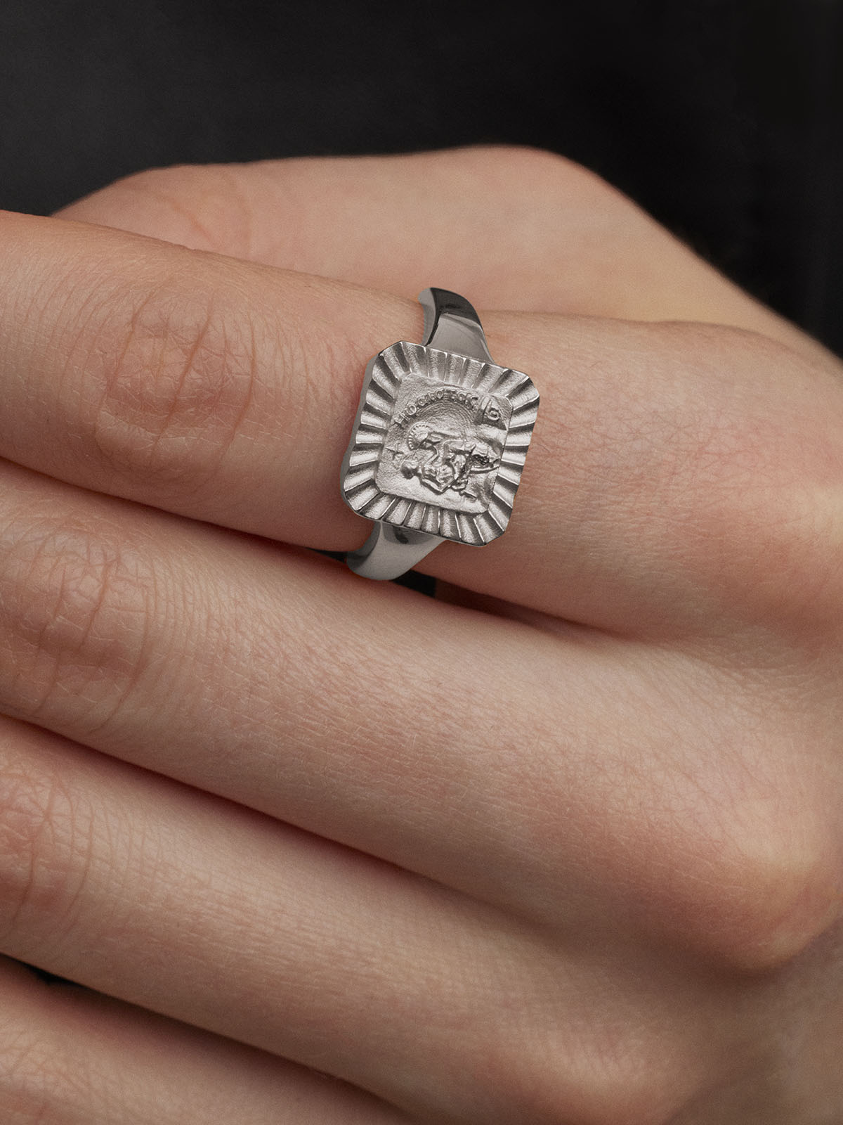 Inspiriert von griechischer Symbolik und Mythologie haben wir diesen fein verarbeiteten Siegelring entworfen. Mit Helm und Hammer sitzt Hephaistas vor einem Amboss, während der Nordstern über ihr am Himmel aufgeht.