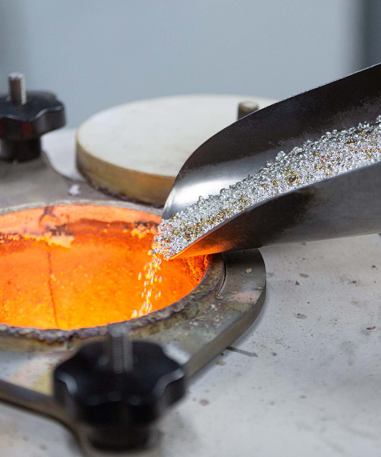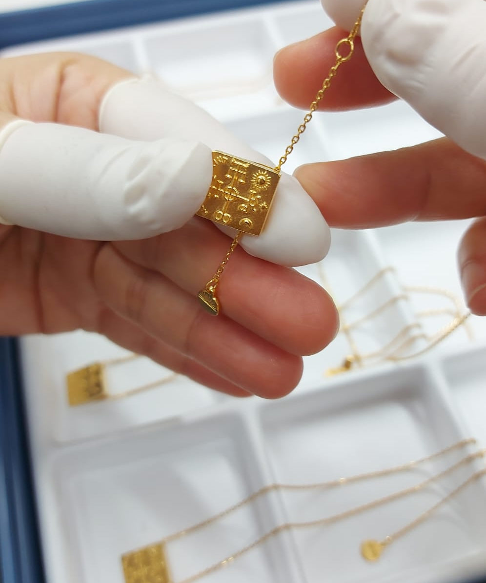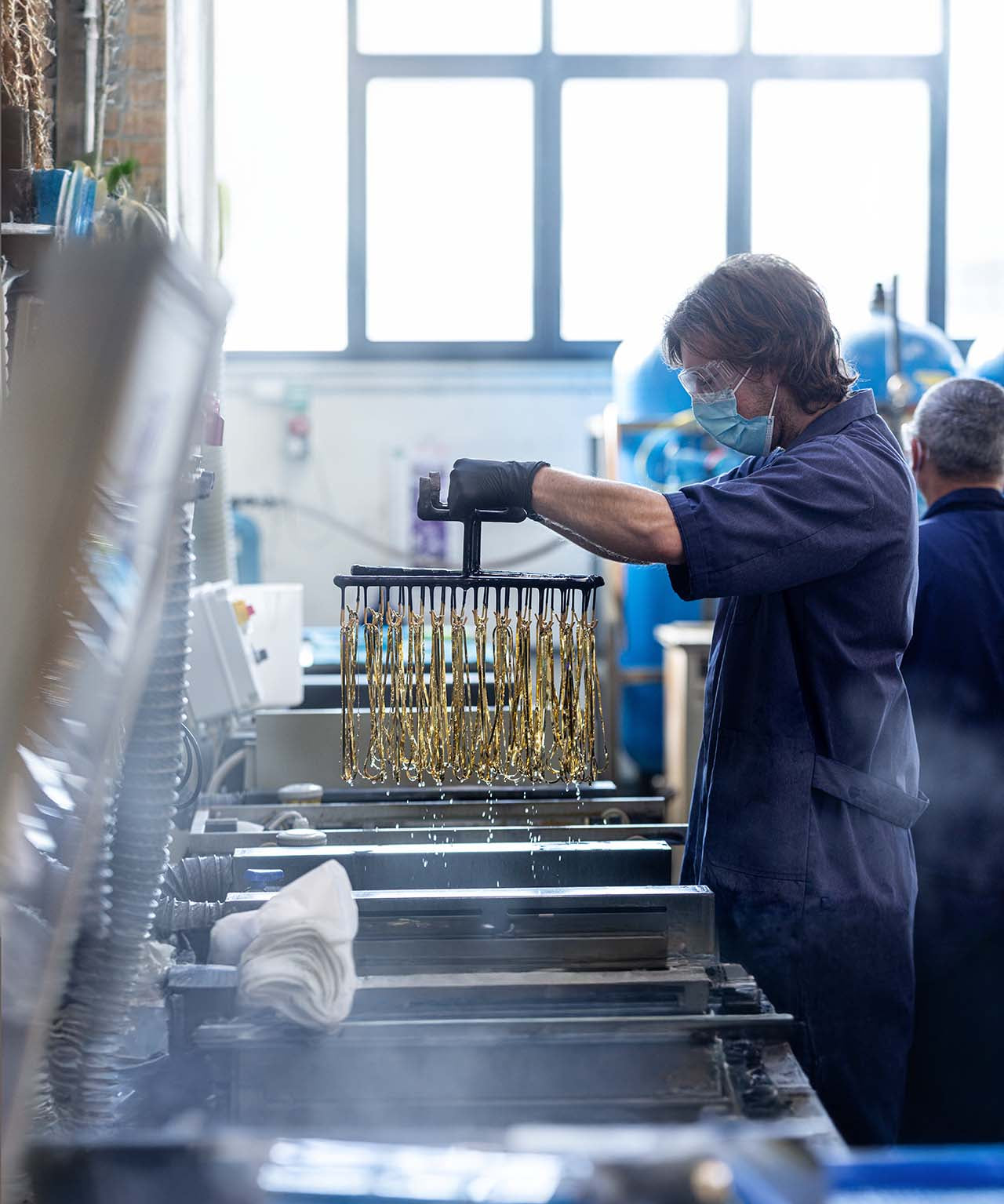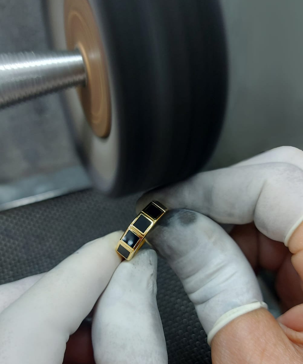 “[...] so wird unser Schmuck per Hand geschliffen, Modelle per Hand geformt, Formen geschnitten, gegossen, poliert, vergoldet [...]. Obwohl teilweise über die Hälfte der Arbeitsschritte von Hand passieren, und es in der Branche gängig ist, lehnen wir es weiterhin ab, unseren Schmuck kategorisch als "per Hand gefertigt" zu bewerben, da dieser Begriff bei Konsument*innen ein Bild entstehen lässt, dem wir nicht gerecht werden können.